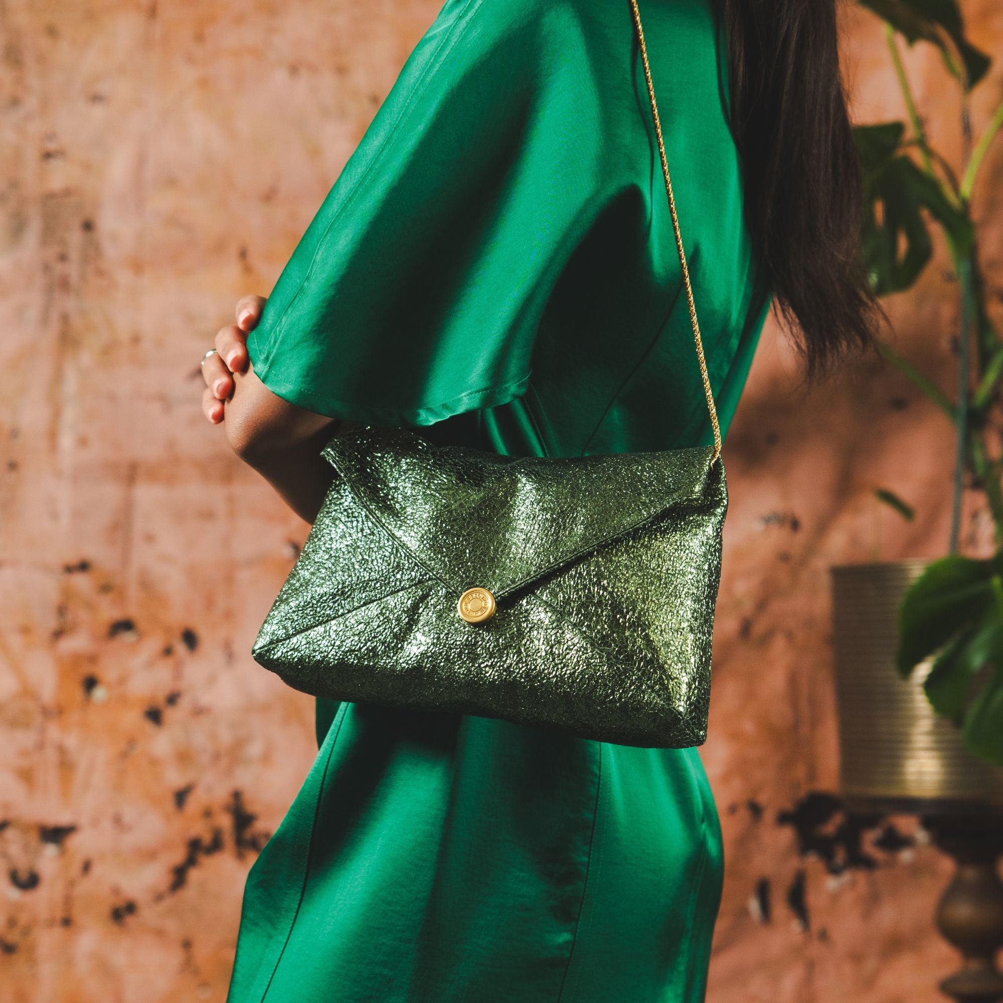 - Double-breasted button closure at side for asymmetrical styling